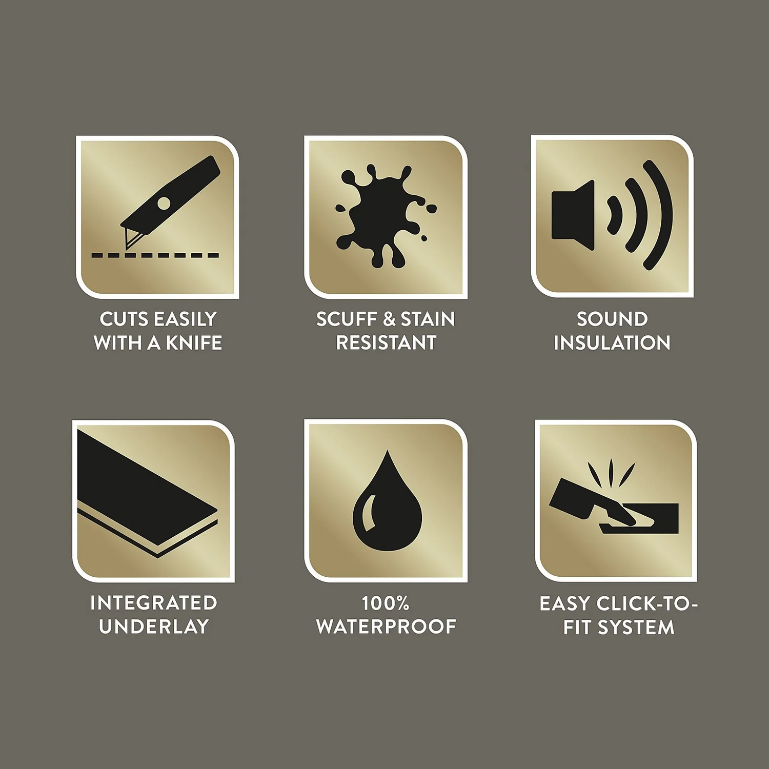 100% waterproof luxury vinyl tile with integral underlay and Tough Core Technology with a natural texture. With hints of white running through the natural brown tones, this finish creates a contemporary twist on a classic look and is ideal for use throughout the house in all living spaces. Cuts easily with a knife to install quickly and simply with the click system. Provides an easy clean flooring solution, resistant to scuffs and stains.